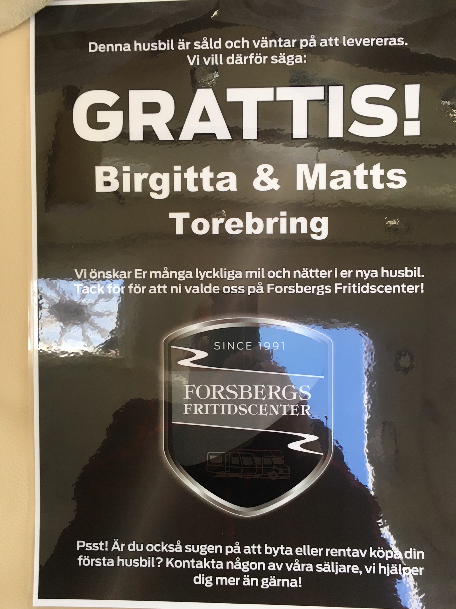 Vi rullar sakta de sista meterna, in till Forsbergs i Mantorp, med vår förra Kabe. På plan står Peter Östlund, platschef i Mantorp, möter och välkomnar oss. Vi tror inte våra ögon, när Peter presenterade vår nya bil för oss. Röda mattan är utrullad, en jättestor sju- armad ljusstake brinner. På dörren står det…