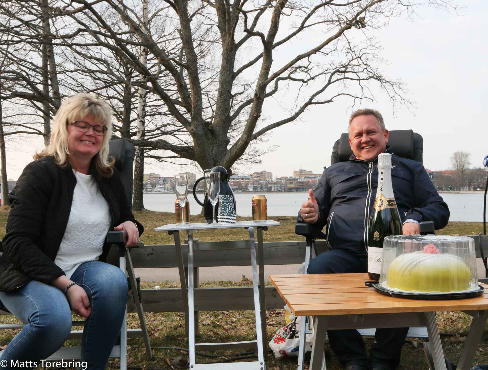Jag startar bilen och kommer, sa han! Helt Otroligt! Precis när Henrik & Anette rullade in på rastplatsen vid tjugoetttiden, hade vi löst problemet. Vi kunde fira med (alkoholfri) champagne och räksmörgåsar. Vi fack massor av andra tips. Hur tackar man sådana vänner? En stor kram är det minsta vi kan ge.