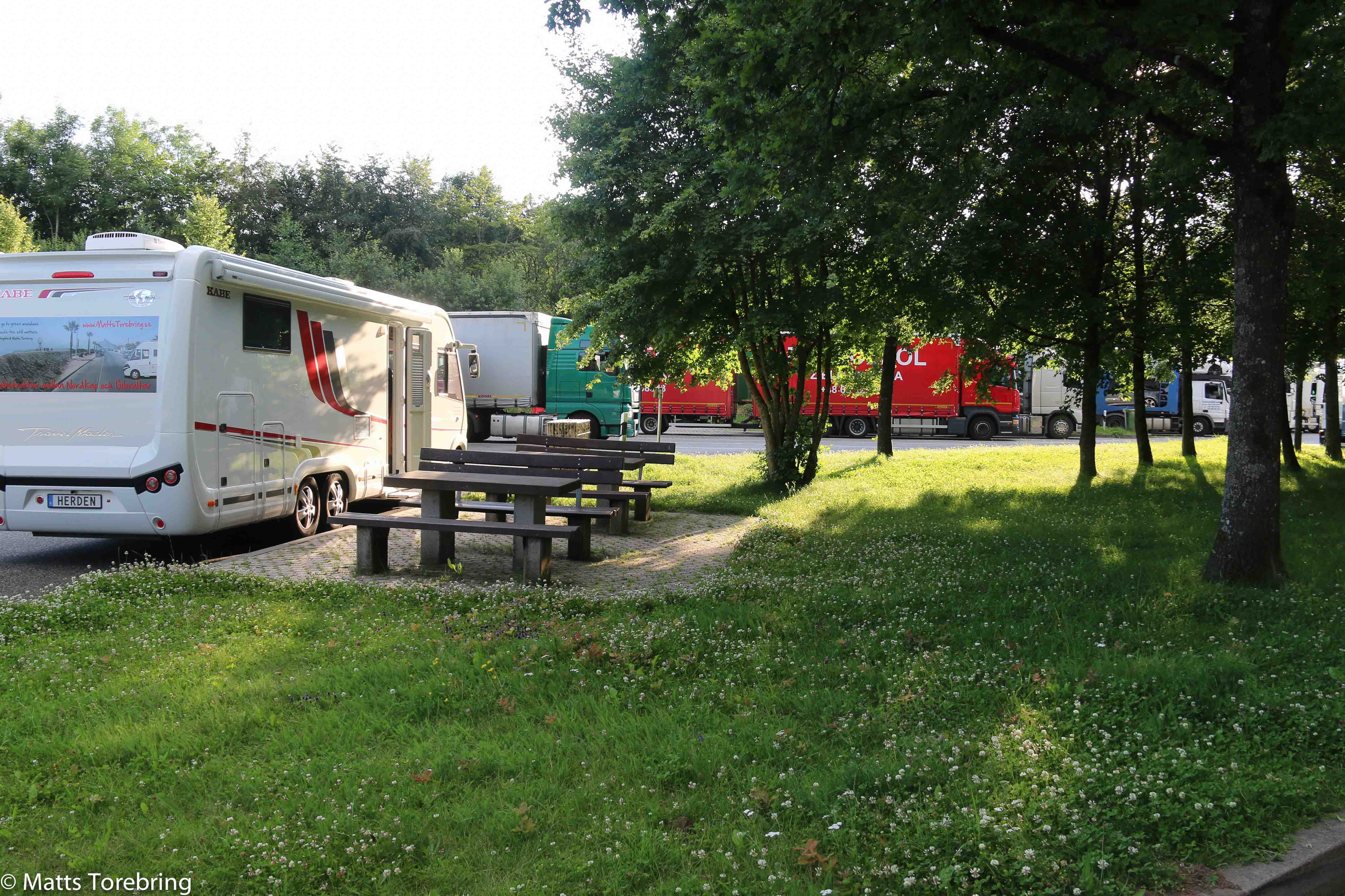 Mitt emot oss stod en en husbil från Finland. Vi sitter och äter frukost, när grannen gör sig klar att åka. Jag kan inte äta, jag mår illa, sa Birgitta. Då släppte bilen ut sitt gråvatten på tomten och alla vet, hur det kan lukta när det är mer än +30 grader ute. 150 meter ned på gatan finns en smidig och toppmodern servicestation för husbilar. Varför gör man så?