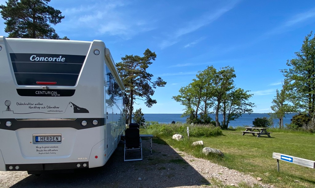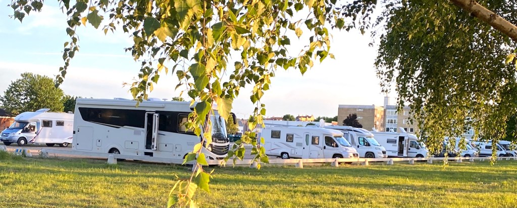 Det blev många svängar omkring i stan innan vi hittade Ställplats Strandvägen som jag sett ut hemma. När vi såg hur fint det är här och dessutom ingen kostnad, då blev jag genast på gott humör igen.