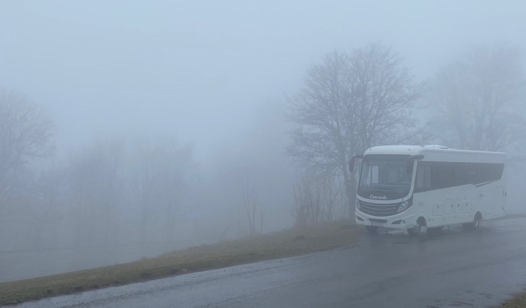 Det var på gränsen att vi såg att svänga in på rastplatsen i dimman.