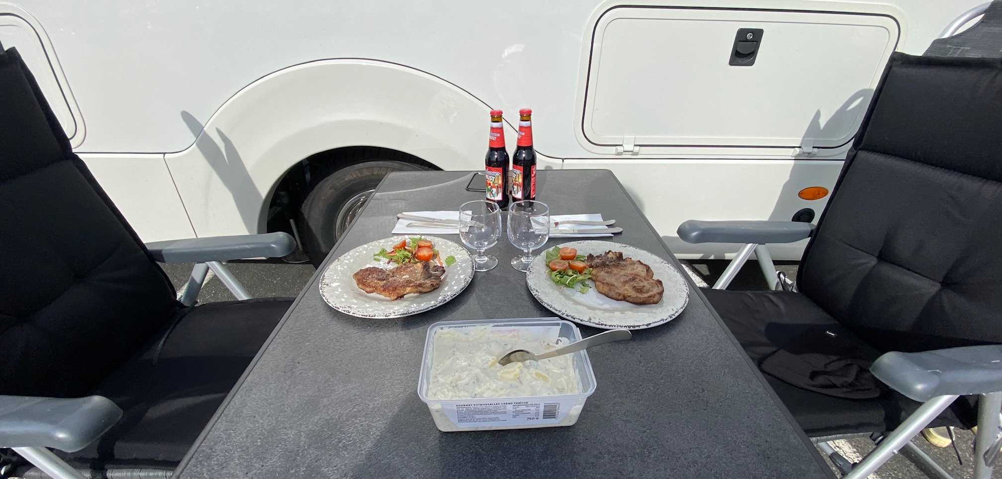 Det är tydligt markerat att parkeringen är gratis och gäller under ett dygn. Så snart vi parkerat på den ganska rymliga platsen, gick jag över gatan in till Lidl. Där inhandlade jag det värsta vrålfika för endast 70 kr. Eller vad sägs om 2 ganska stora baguetter, 2 stora äppelrullar i smördeg, 1 paket salami, ett paket Lyonerkorv med champinjoner samt en chips påse till kvällen. Det känns oLidligt billigt. Strunt samma, finessen är att ha allt det goda på andra sidan gatan.