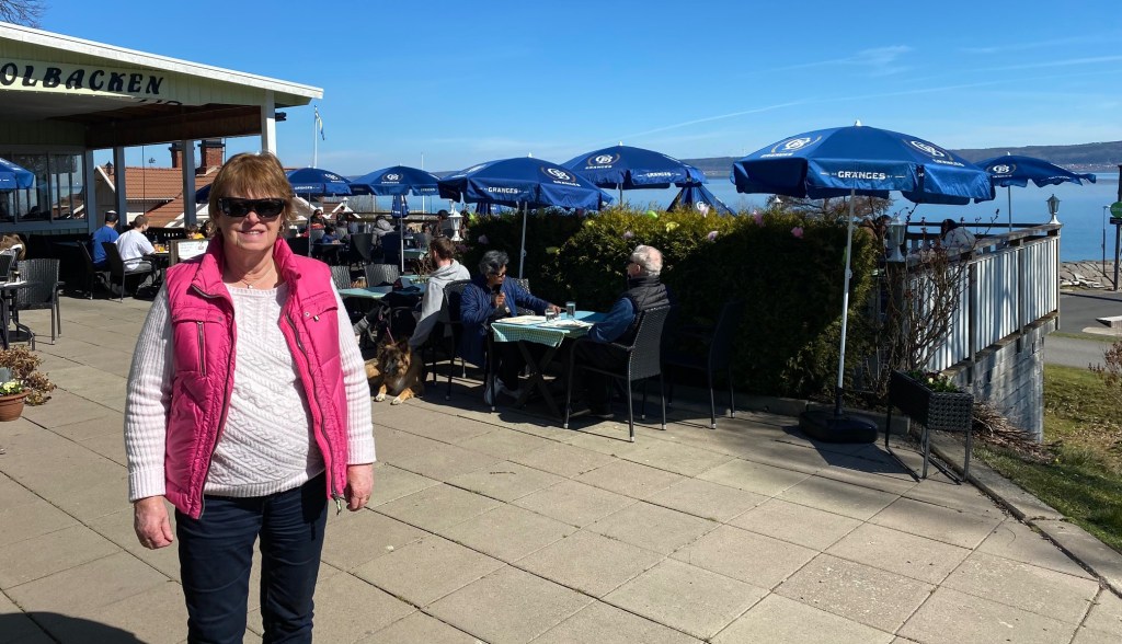 Vi åt Dagens rätt, som bestod av marinerade revbenspjäll, sallad och grillad klyftpotatis, inkl. kaffe, finkaka och lättöl, kostnad 119 kr per person. Jag hörde samma sak från andra gäster, ”Vilken miljö, så god mat och helt fantastiskt gott!” ”Var finns benen till revbensspjällen?” frågade jag. ”De är kvar i köket,” fick jag till svar.