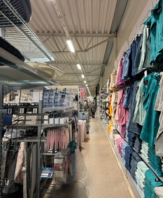Ett Megastort handelshus, som har allt som vi inte behöver just nu. Förlåt, vi köpte en flaggvimpel och ett paket påskservetter.