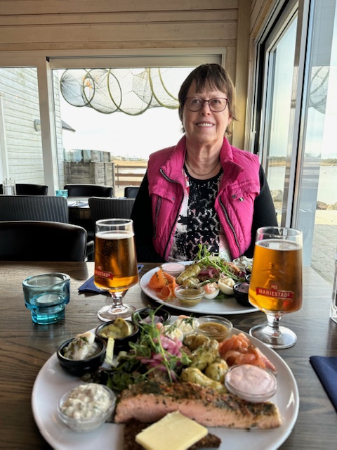 Fyra sorters sill i var sin lilla karott, rikligt med små goda potatisar, bröd, ost, en jättestor gravad laxbit, två röror, inlagd strömming, två ägghalvor och mycket varmrökt lax med hovmästarsås. Det var på gränsen för mycket av det goda.