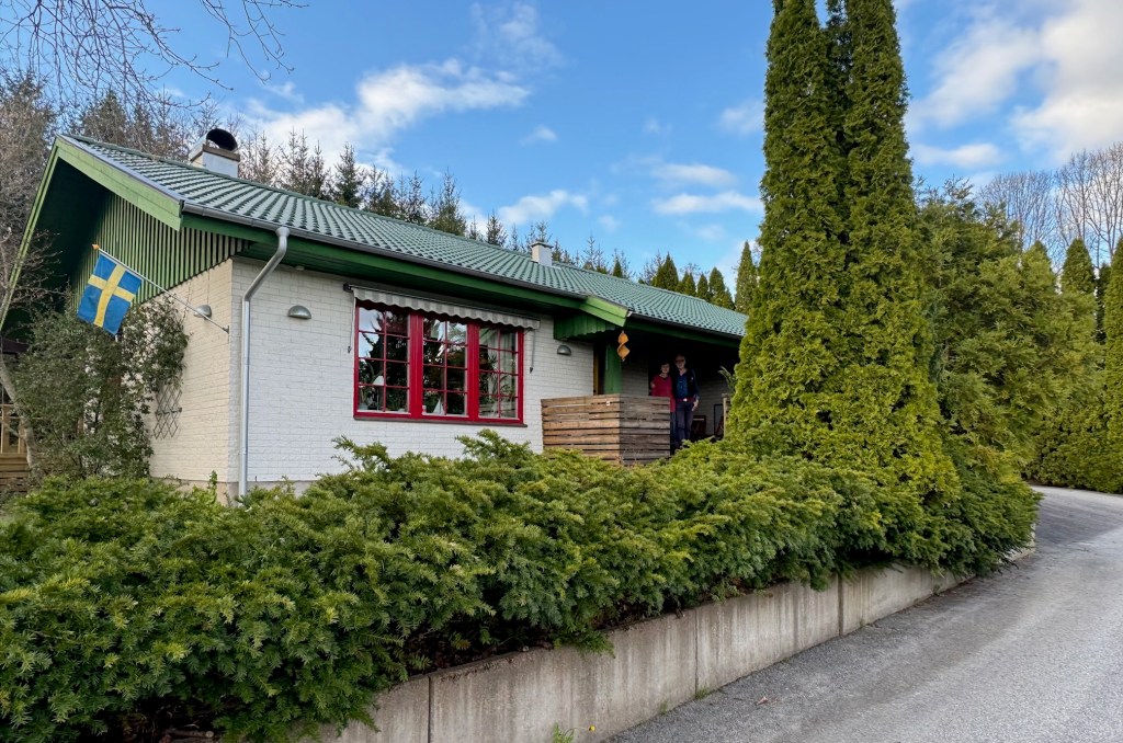 Ett fantastiskt hem, inbäddat i grönska och som gränsar mot vildmark. Nu står de på trappan och vinkar, när vi tar farväl efter en hel eftermiddag.