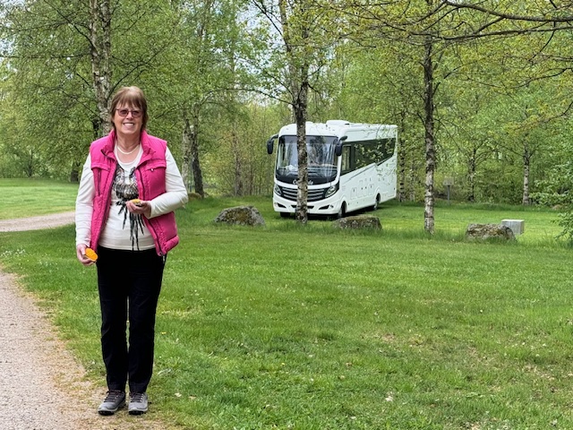 Nu var vi tvungna att hitta en ställplats med el, om vi inte ville åka hem redan. Vi åkte till Preem för att tanka AD Blue, men den var ur funktion. Vi körde till Eksjö Camping ställplats. Där möts vi av stora skyltar ”Öppet hela året!” Bommarna var nere och ingen svarade i jourtelefonen. Här på Ställplats Eksjö City har vi aldrig parkerat tidigare. Lite för smala platser, annars rena toppen. Platsen ligger på en höjd med bra utsikt och bara ett stenkast till Lidl och ICA Supermarket. Platserna är bokningsbara. Idag var alla lediga när vi kom. Priset var denna gången 200 kr inkl el.