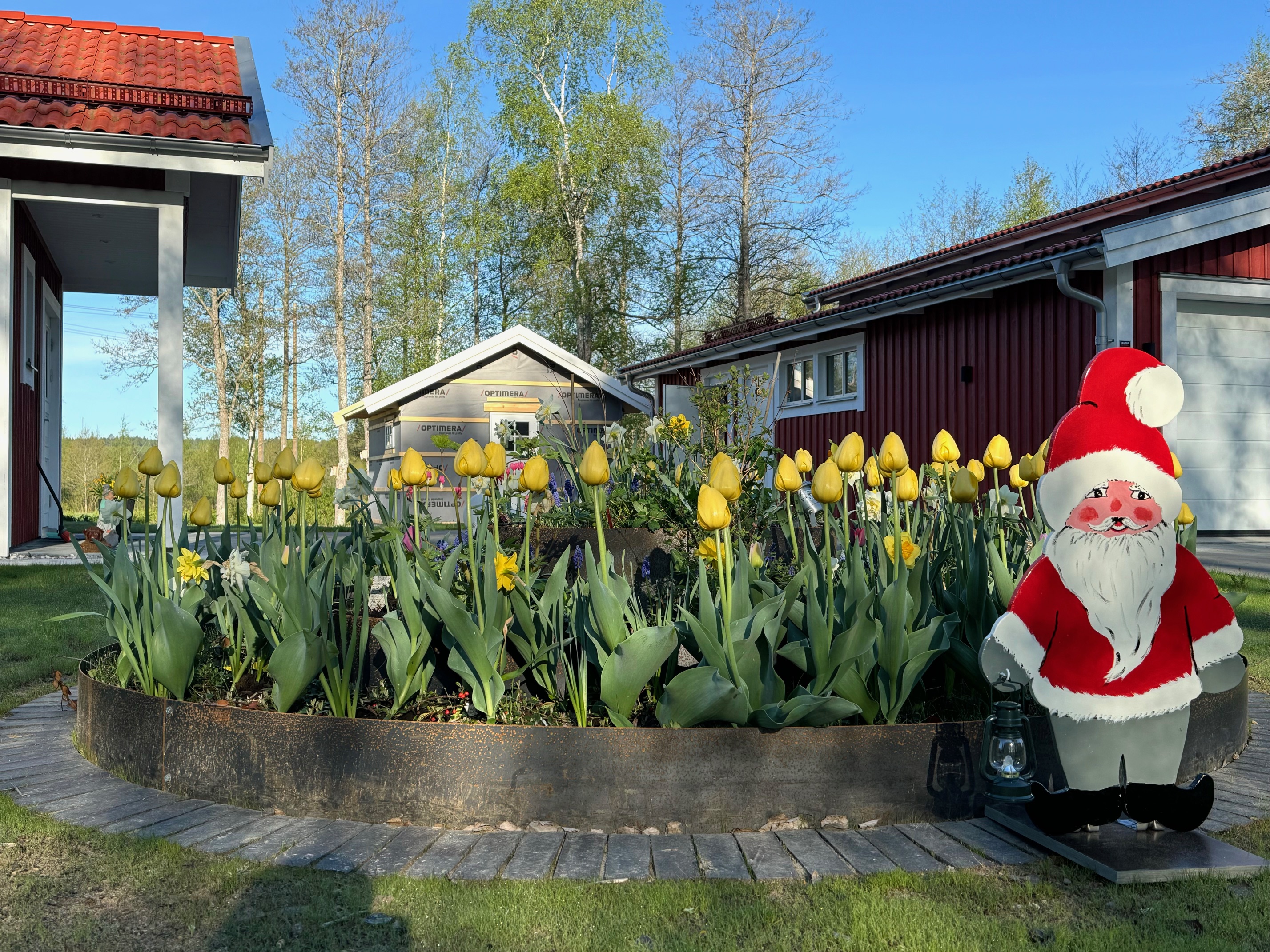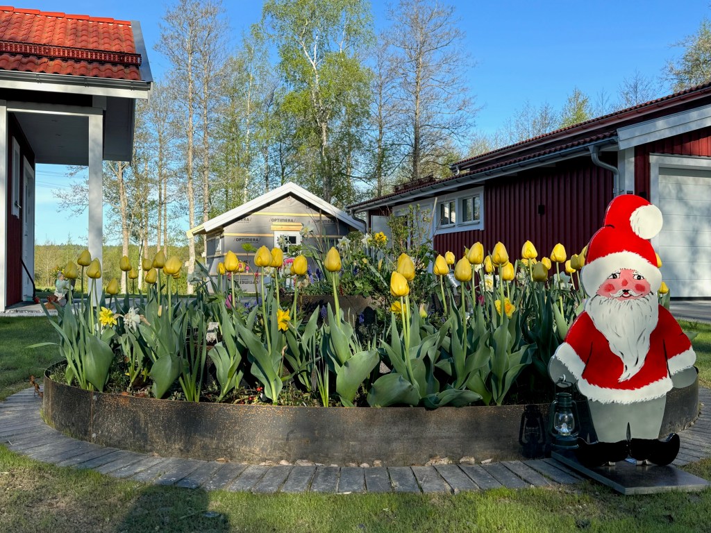 Tala om överraskning när vi kom hem från vår resa ned till Skåne. Vi visste ju om att vi fått storfrämmande från Jakobsstad, Finland, när vi var ute på resa. Vi anade att våra Finska kamrater lämnat en present hemma. Döm om vår förvåning när det står ”en livs levande Tomte” ute på gården tillsammans med alla våra blommor.