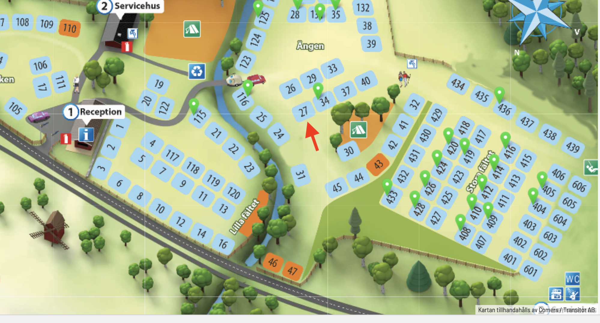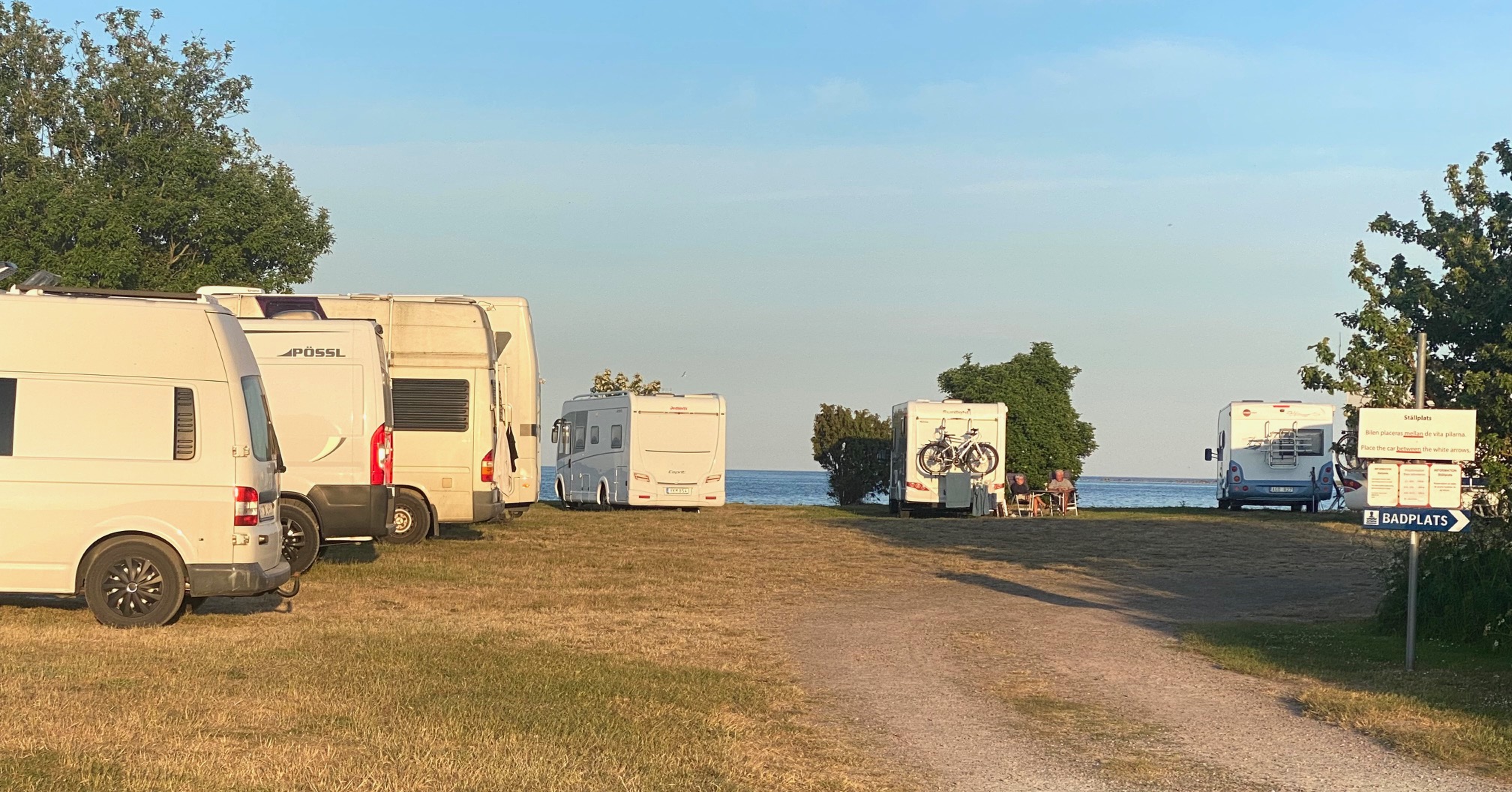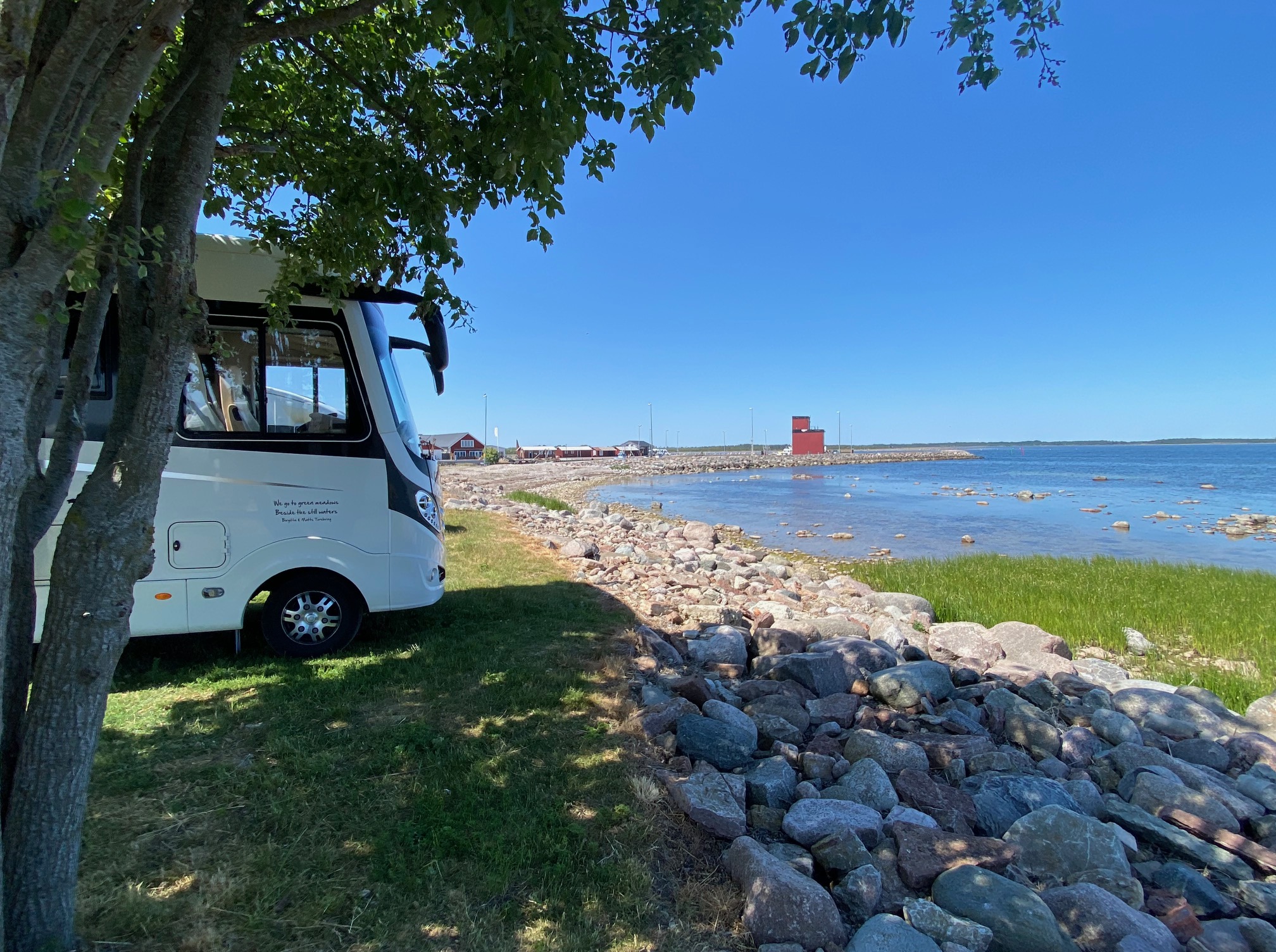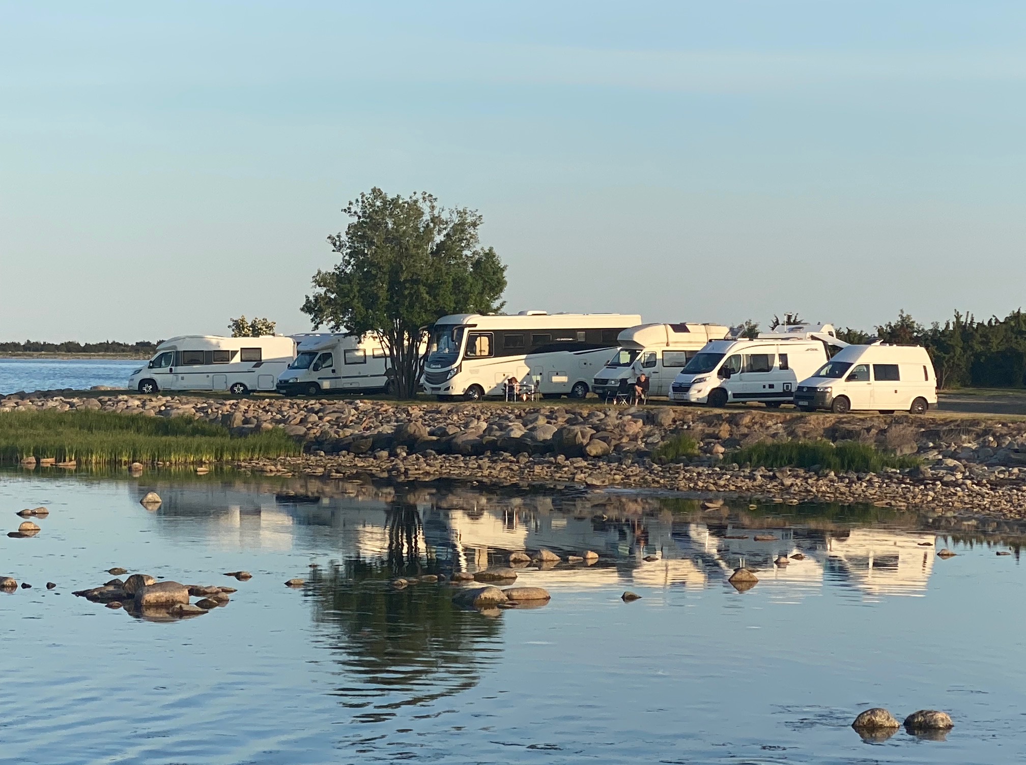 Här finns en 30- tal platser med ”riktiga” elstolpar, sopsortering, färskvatten och grå- & svartvatten tömning. Elplatserna är bara säkrade i 6 amp. Pris 200 kr! Så vill Birgitta & jag ha det, (helst vill vi ha 16 amp.) vi vill inte betala för dyra toaletter och duschar som vi aldrig besöker.