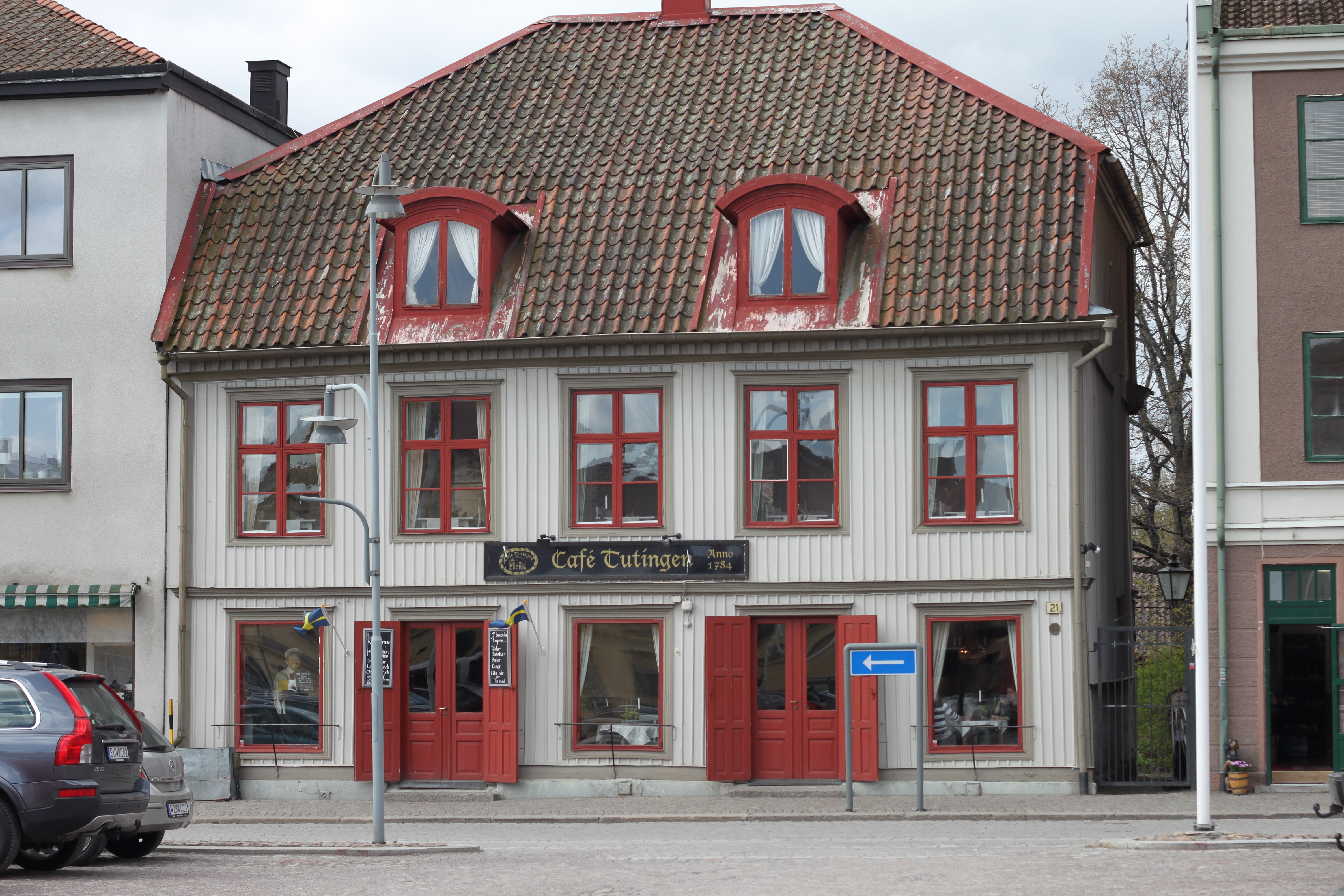 När man går ut till stugorna går man genom gårdsbutik, café och restaurang efter att ha betalat det lilla inträdet i kassan.