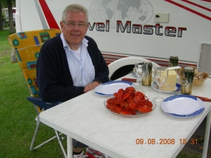 8 08 2008En del av sommaren är en resa till Hjo. Sova lugnt och skönt på parkering vid grönområdet mitt i stan. Gå till hamnen och köpa färska nykokta kräftor från Vättern, vidare till hamnbageriet och njuta av kaffe i den stora trädgården (i år blev det bara chokladbollar och kaffe vid husbilen) samt gå en runda i stadsparken. Efter en förmiddag i Hjo har vi vår favoritplats i Karlsborg vid Göta Kanal mitt emot Idas Brygga. Här åt vi oss mätta på 11 st jättekräftor och lite tillbehör. Ett annat år när vi stod på samma plats intog vi en matbit på Restaurang Idas Brygga till en kostnad av 600:- (2 pers). När vi kom till husbilen tog vi fram smörgås ur kylen för att bli mätta.