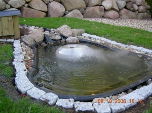 Ytterligare ett arbete återstod var att lösa och det var dagvattnet från stuprör som rann rakt ut på min nylagda marksten. Efter mycket funderande grävde jag helt enkelt ner avloppsrör och anslöt till stuprören. Vattnet ledde jag fram till min stenmur där det blev ett litet vattenfall. Från stenmuren gjorde jag en bäck som blev nästan tolv meter lång. Där bäcken slutar grävde jag en ny stor grop som blev en damm som samlar upp vattnet. På botten i dammen lade jag en pump till fontän och till att pumpa runt vattnet i bäcken. Nu rinner vattnet i bäcken och porlar mellan stenarna och ett litet fläkthjul från en gammal kaffemaskin snurrar som ett vattenhjul. På botten i dammen ligger det lampor som tänds när skymningen faller. Vattenpumpen har en UV lampa som håller vattnet rent i dammen. När det regnar fylls vattnet på och smuts flyter över dammkanten. På strandkanten står en fiskare (i keramik) bredvid sin båt och kikar efter bra fiskeväder. På strandkanten finns även fyr, en fiskmås, en noshörning samt någon groda i bäcken, allt i keramik.