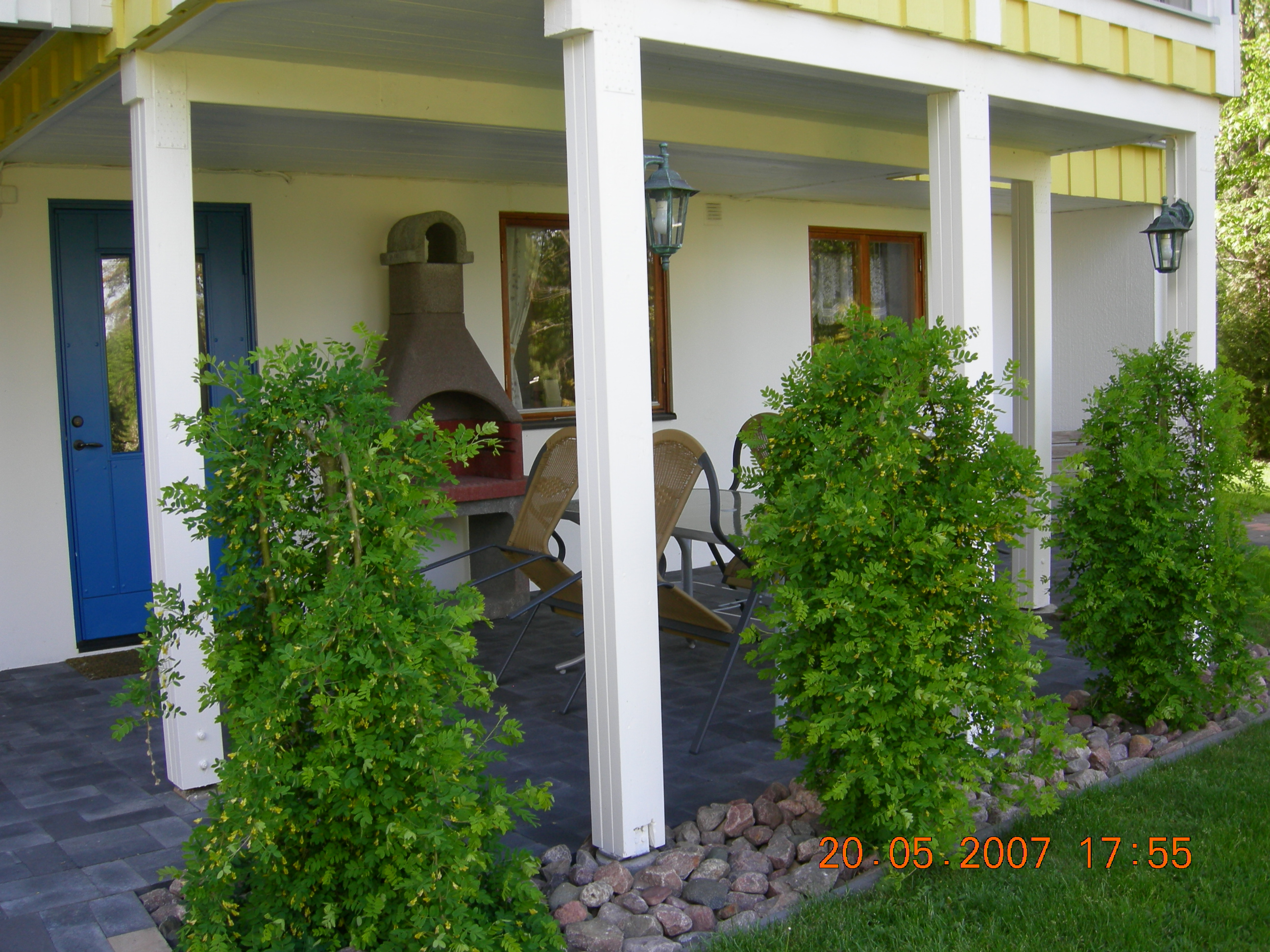 Nu återstod planteringar i alla de djupa hål jag grävt upp. På baksidan blev det Ädelsyren i två gropar, Rosenhagtorn i en grop samt två st olika Paradisäppelträd. Mellan uteplats under vinterträdgård hade jag lagt kullersten en 60 cm bred rabatt och med kantsten mot gräsmattan. I denna hade jag fyra större hål där jag fick tips av, Bälaryds egen Carl von Linné, Christer Haak, att plantera Hängcaragan. Detta var ett tips jag är stolt över. De växer så det knakar trots torka delvis under ett tak.