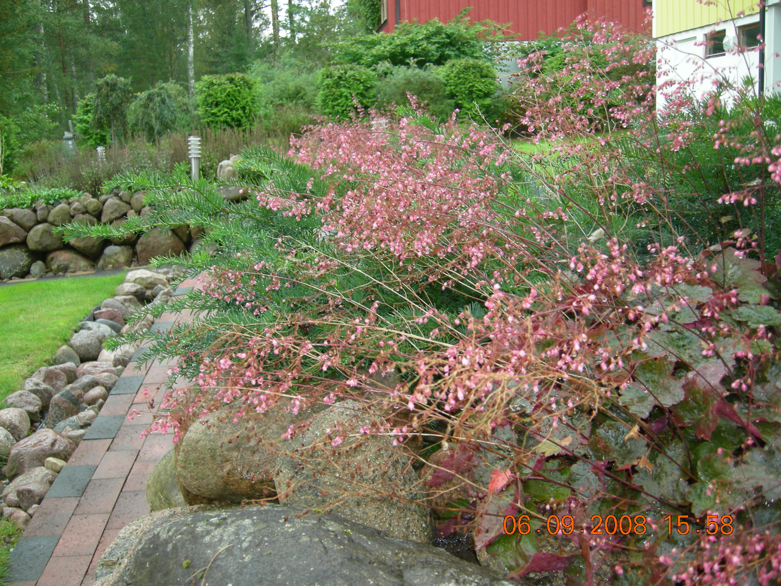 Jag är faktiskt stolt över min trädgård, även om stolthet är en av de sju dödssynderna, stolt är jag därför att allt har klarat naturens påfrestningar genom kalla vintrar, genom den blöta sommaren 2007 då det kom 374 mm regn när vi var i Italien under fyra veckor. Inget har ändrat sig, ingen jord har runnit ut osv. Jag fick ta del av filmer på vattenmassorna från Niklas hemma i Sverige sända mobilt ner till oss i Italien. En natt drömde jag att två älgar och fyra rådjur hade dränkt sig i dammen jag byggt. (Den är inte så stor att de får plats). Jag ringde på nödslakt, som pappa gjorde hemma på gården, och sedan vaknade jag.