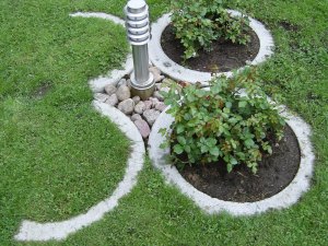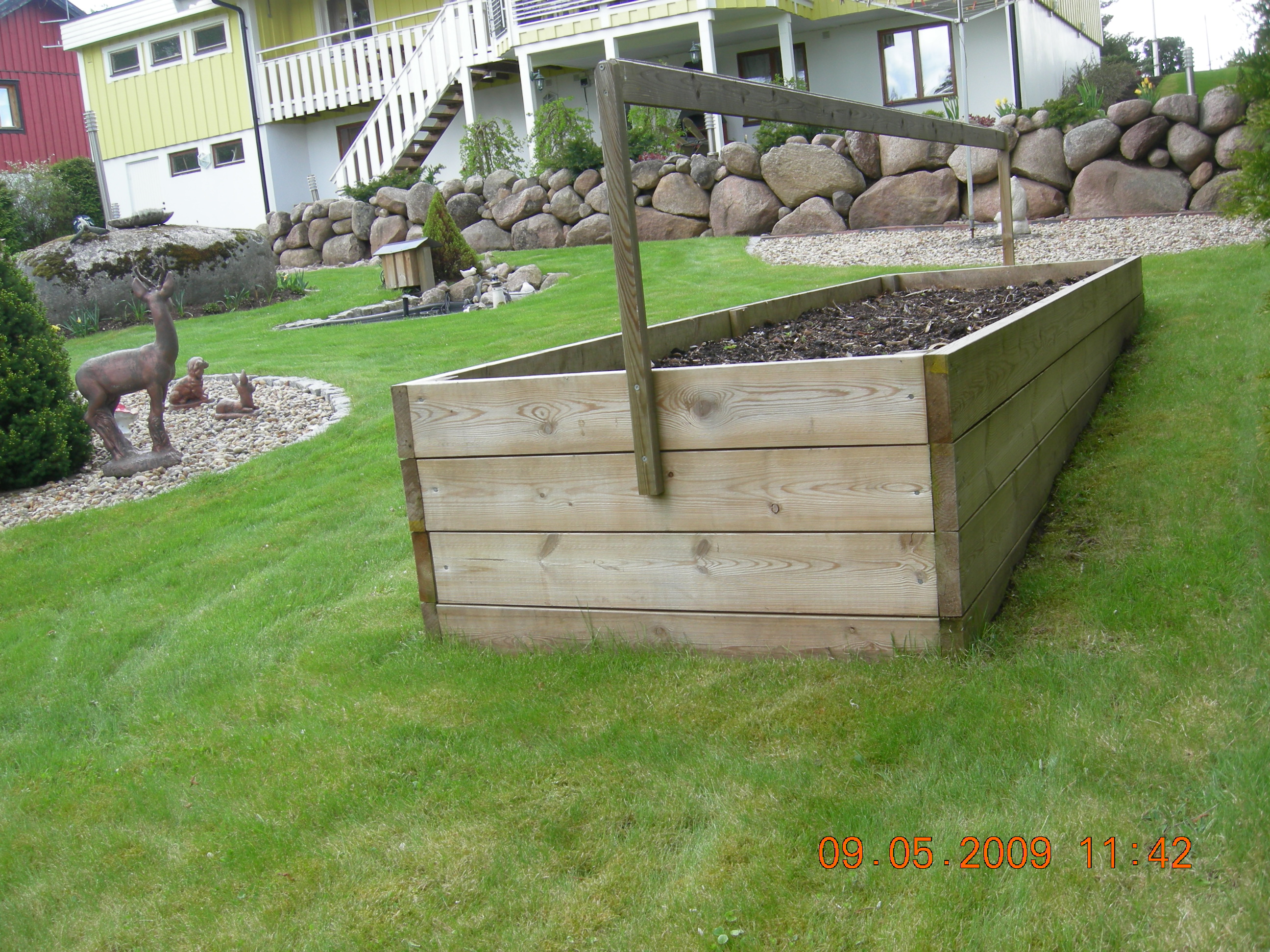 Mot Skogsgatan var det ett vitmålat staket som färgen börjat flagna på. Under färgen var virket redan uppruttet. Jag tog ner staketet och började lägga grund för en ny stenmur. På mitt speciella sätt fastnade jag för trappstensblock i betong. Vikten var 73 kg per styck. Jag ställde ett block på högkant och lade sedan 2-3 st på längden mellan stolparna. Till sist fäste jag en grov galvaniserad kätting hängande mellan stolparna. Nu 12 år senare står muren lika spikrak opåverkad av vinter och kyla. Jag tyckte så bra om trappstensblocken att jag kom att använda dem till flera olika projekt. Totalt har jag “burit” ut 123 st till olika ändamål i trädgård.