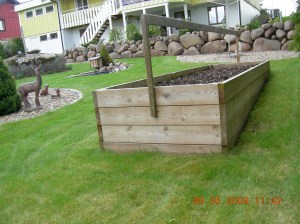Jag hade en tid, på det som sedan blev lek och plan yta, haft ett stort potatisland. Det tröttnade jag på då potatisen var genomborrad av gula maskar. Jag gjorde nu en odlingsbänk som fick måtten 1,25 x 4,20. Jag fyllde den, cirka 60 cm djup med lövkompost. Denna hämtade jag hos vår son som ännu inte delar mitt trädgårdsintresse lika mycket. Sista veckan i mars i år planterade jag cirka 5 kg potatis. Jag spände väderbeständig plast över och själv spände jag pjäxorna på foten och körde WC backen i Lillehammer några dagar senare.