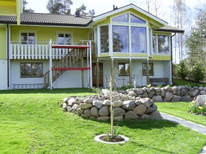 Vi har nu 8 rum och kök i ytterligare ett sutteränghus. I vårt förra hus hade vi entré i källarplan och även garage till bilen. Nu har vi entré på övervåningen och garage på sidan av huset. Vi stortrivs fortfarande efter snart 18 nya år i vårt hus.