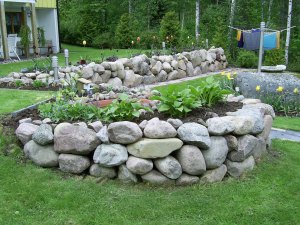 Innanför alla stenmurar hade jag lagt all matjord jag flyttat på. Det var nu minst 60 cm djupt med jord. Där har jag planterat krypande Idegran, Alunrot, Steppsalvia, Hosta, Höstflox, Höstanemon,