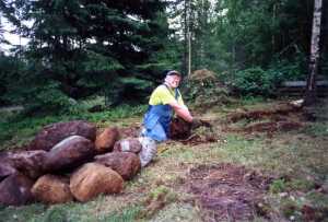 Nu började det kanske allra största arbetet kring vårt hus. Birgitta hade halkat i en av slänterna på baksidan på väg till torkvindan. Så kan vi ju inte ha det tänkte jag, Birgitta som gör ett fantastiskt arbete på jobbet, i kyrkan och inte minst hemma måste ju ha det bekvämt och smidigt. Tanken var klar, jag började gräva för gångar, trappor, uteplats, samt Friggebod i den nyanlagda gräsmattan. Gången fram till torkvindan, som var fastsatt i en jättestor sten i markytan och som jag borrat hål i och monterat torkvindan i, grävdes 1,5 meter bred. Jag grävde cirka en halv meter djupt och fyllde igen med krossat berg. Cirka 70 cm av gången skulle jag lägga marksten på och resten skulle jag ta till mina stora stenar och bygga en stenmur, se bilder från baksidan. Tack vare att all jord och fyllning kördes på en skottkärra lades jord till rabatter på rätt ställe och annat material som markfyllning. Jag grävde gångar till torkvindan, till Friggeboden, till skogen samt en uteplats under vinterträdgården. Allt grävdes på samma sätt. Nu beställde jag hem flera lastbilslass med krossat berg som jag fyllde i urgrävningarna och packade med en markvibrator. Jag hade mina stenrör kvar sedan tidigare markarbeten och nu ville jag ta bort dem. Det var bara det att under stenrören hade jag stora stenar jag inte klarade av. Jag ringde till min gode vän “Göran i Limna” som kom in på tomten via skogen med sin grävare. Under cirka tre fyra timmar tog han upp en stor mängd stora stenar som han med sin maskins hjälp kunde lägga på plats i min stenmur.