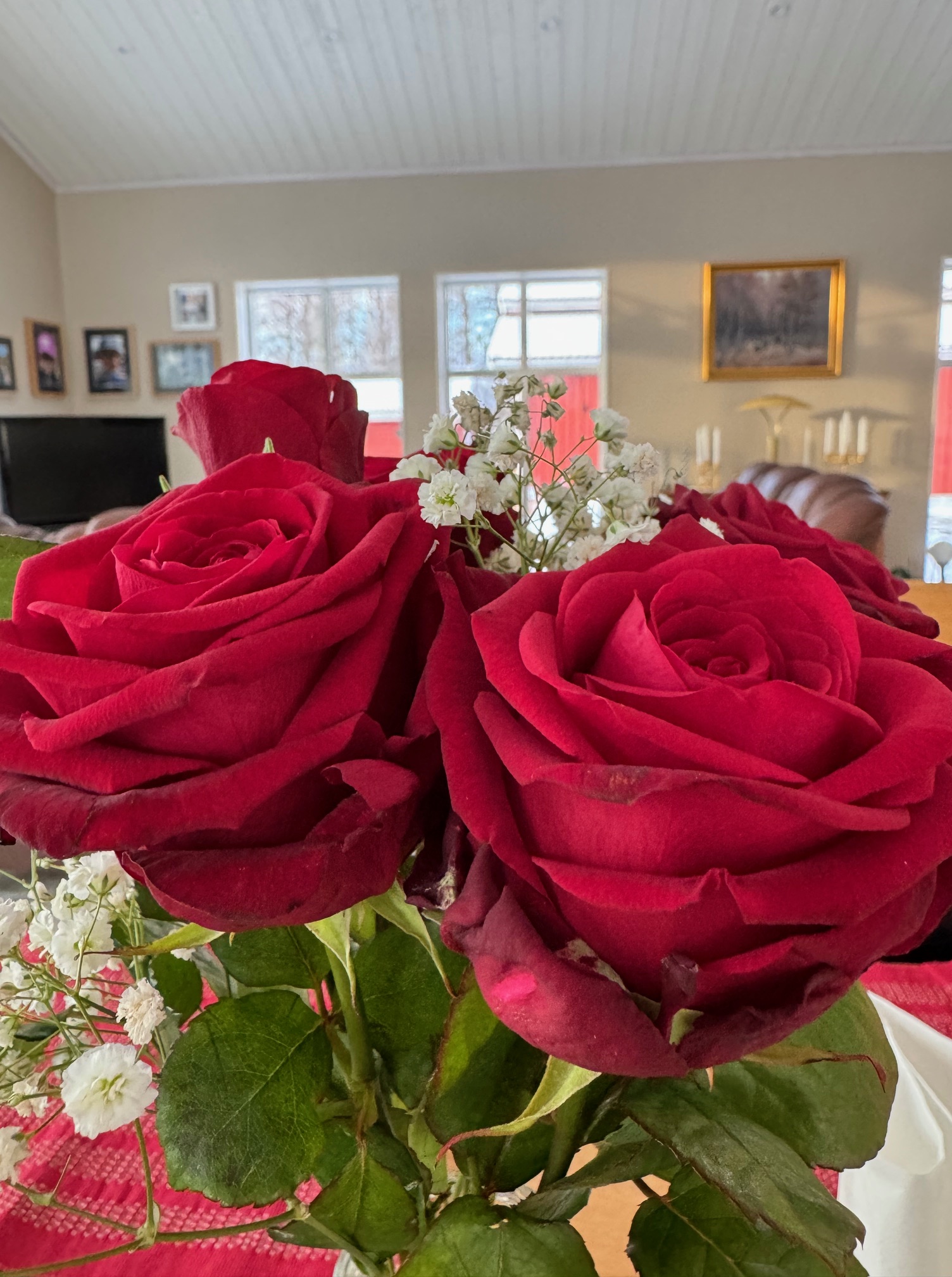 Ett stort grattis från våra barngenom vår son NiklasGästerna var bjudna att komma utan presenter. Foto Linus.Ett vackert minne för många dagar framåt. Foto NiklasMin present till Birgitta. Foto NiklasFem och en halv ros från mig till Birgitta