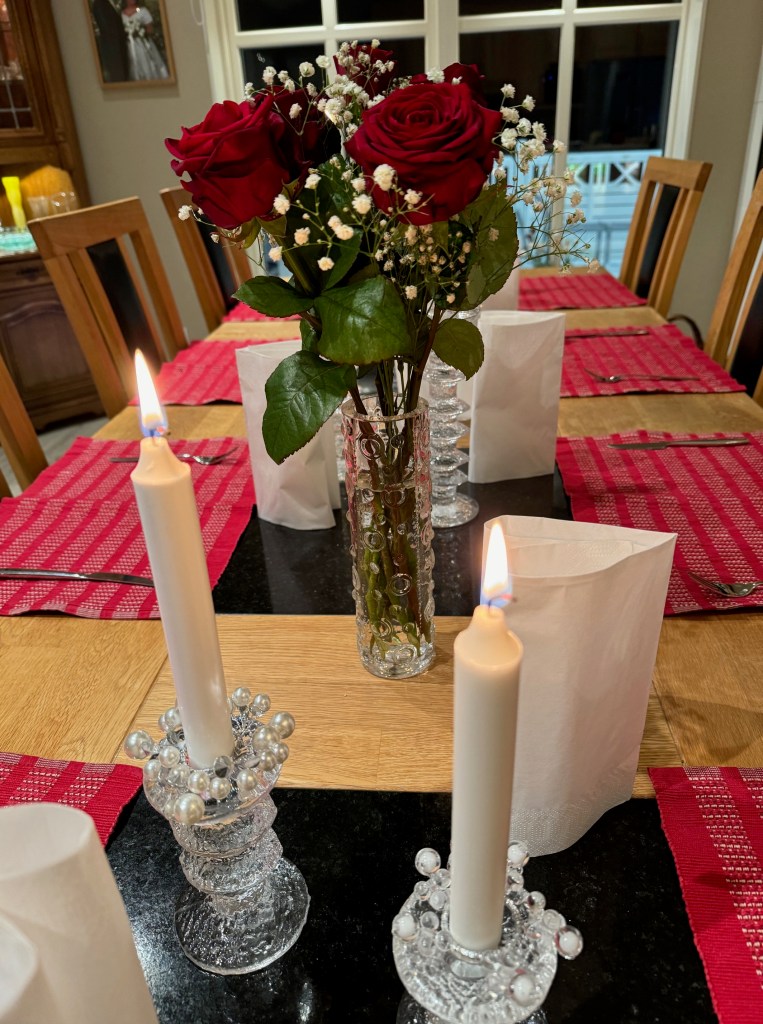 Denna gången firade vi hemma hos oss i all enkelhet, tillsammans med bara Niklas och hans familj. Jag bytte ut tabletter på bordet till röda och vek servetterna som hjärtan