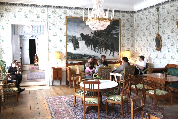Vilken fantastisk plats, Krusenbergs Gård, och så kungligt guldkantat det kunde bli. Efter den fantastiska middagen, satt vi här i stora salen under originalmålningen av Karl XII`s likfärd.