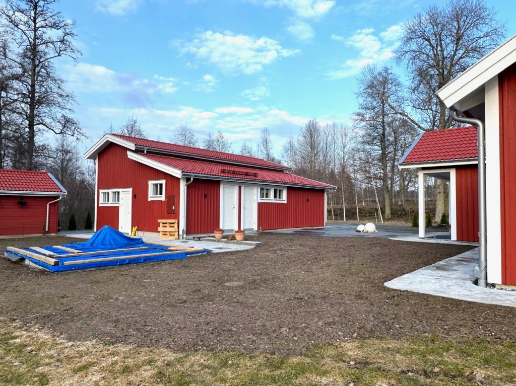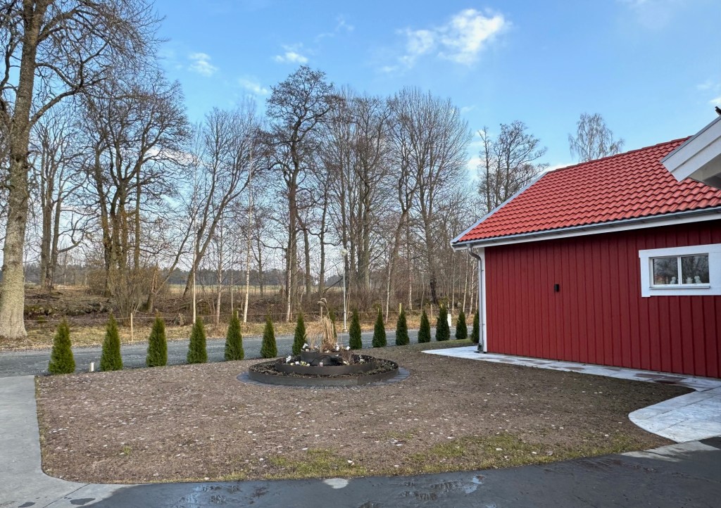 En hel vecka under senhösten hade vi grävmaskin och hjullastare som gjorde gångvägar, markplanering, anlade vår rondell, samt gjorde en husgrund till vår drängsstuga.