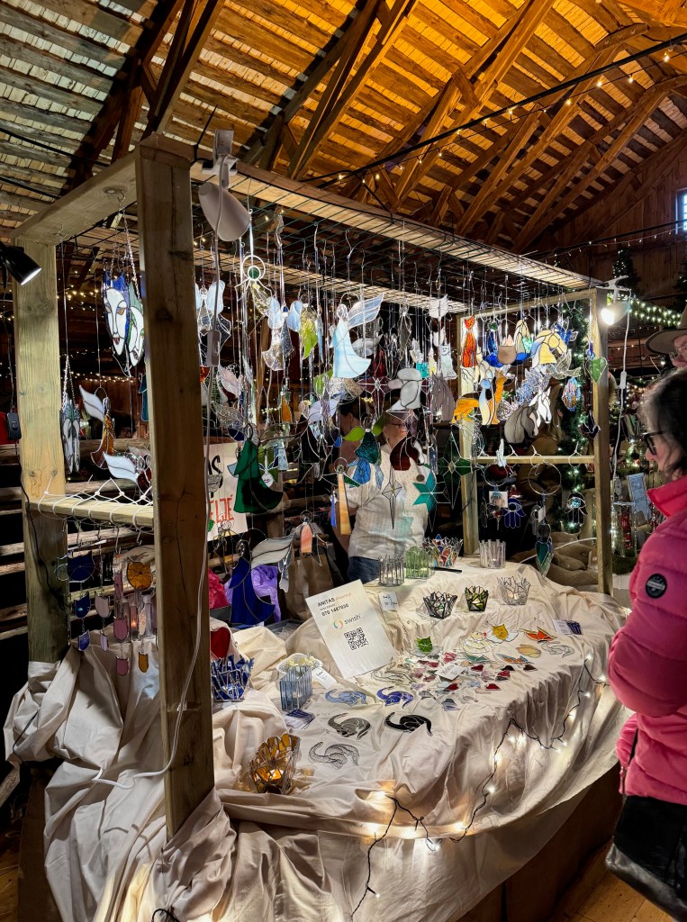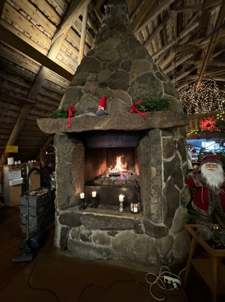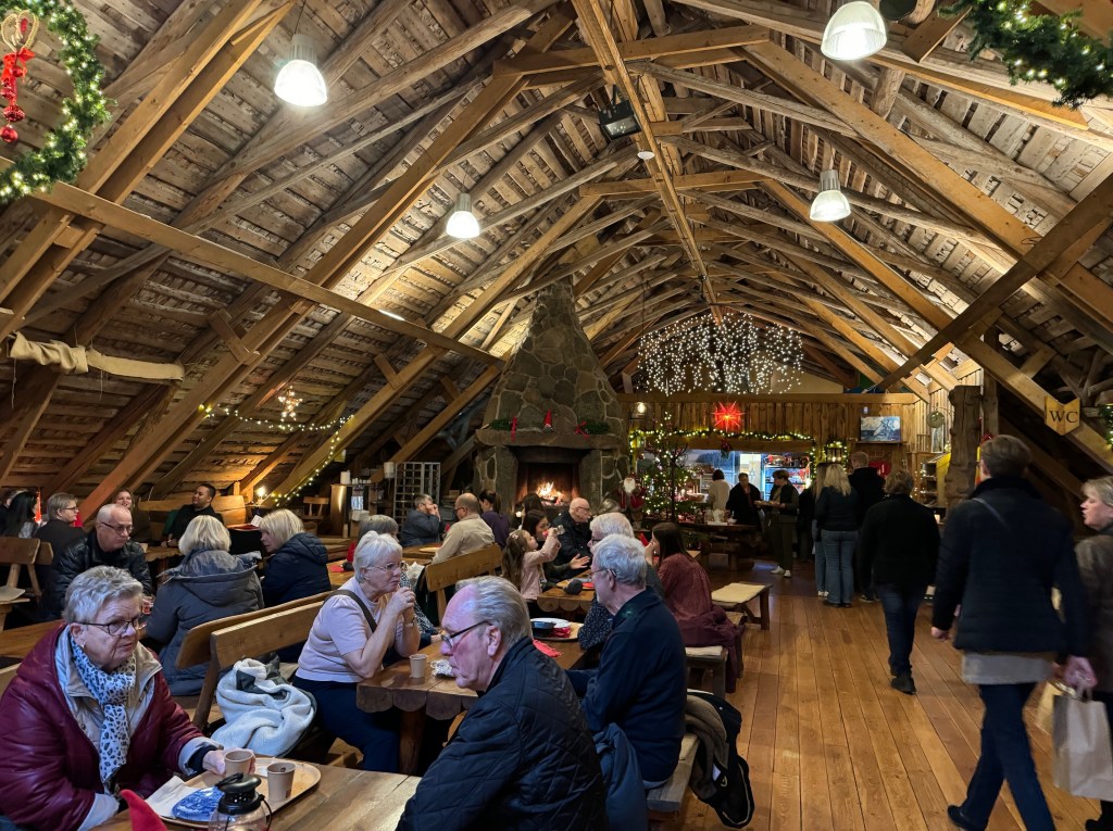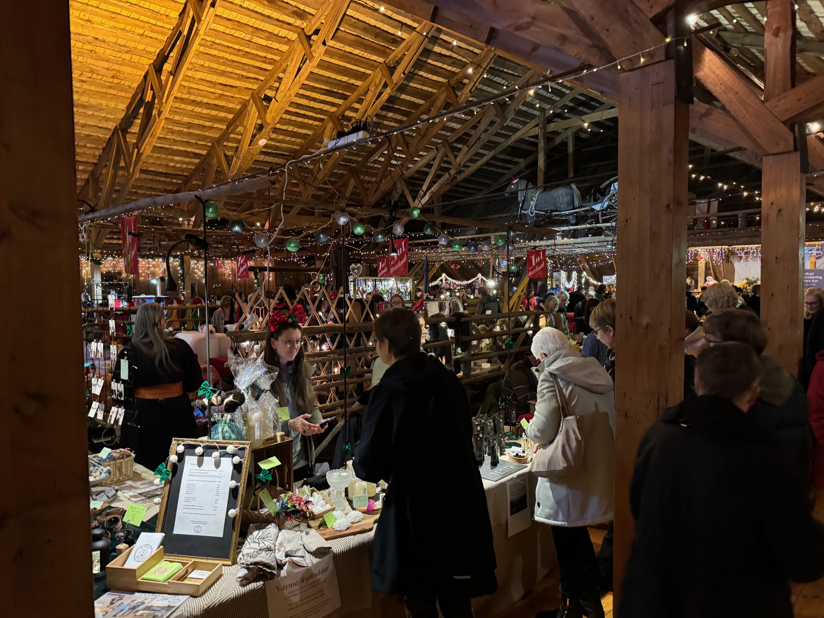 En kraftfull spis finns det på logen i stället för höBirgitta sitter och väntar på kaffe och en julsmörgåsDetta lönar sig säkert mycket bättre än att odla vallfoderDet kändes inte som en julmarknad, utan bara som en marknadVäldigt mycket folk hade kommit till ”Julmarknaden.”Många utställare ute på gårdsplanenBirgitta valde ut en varm mössa