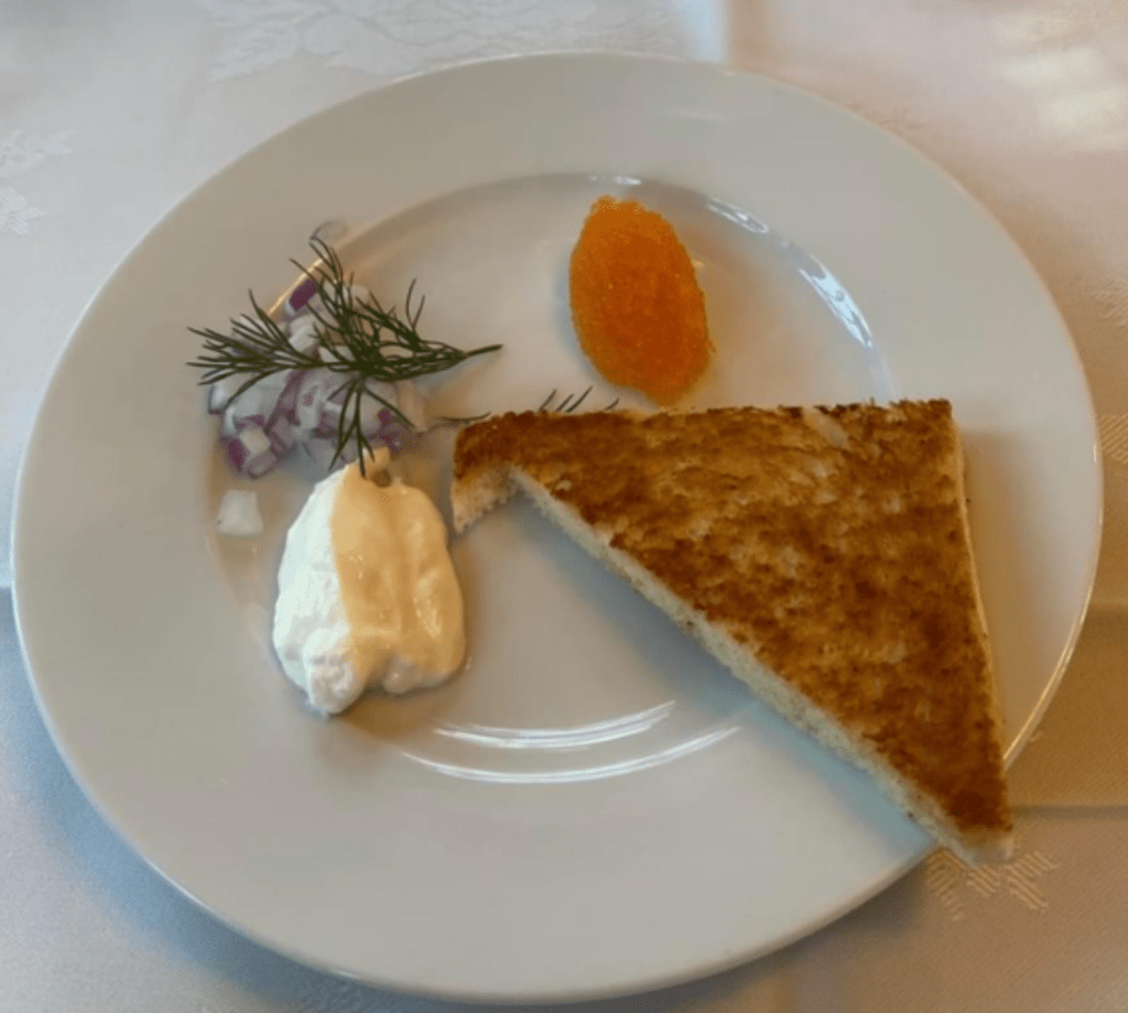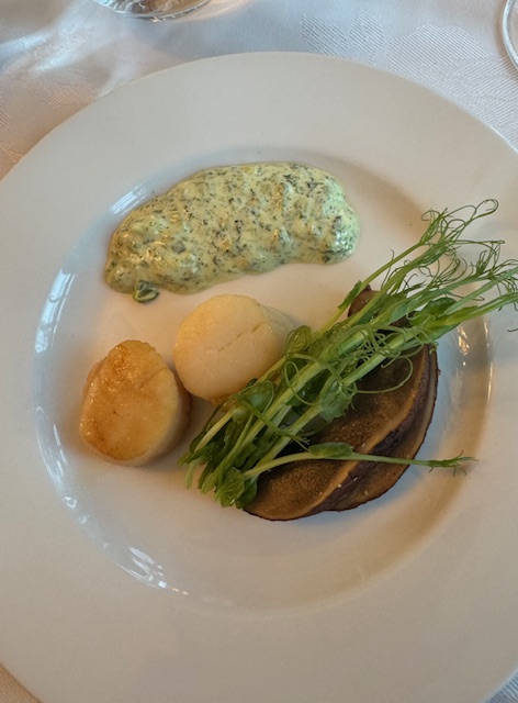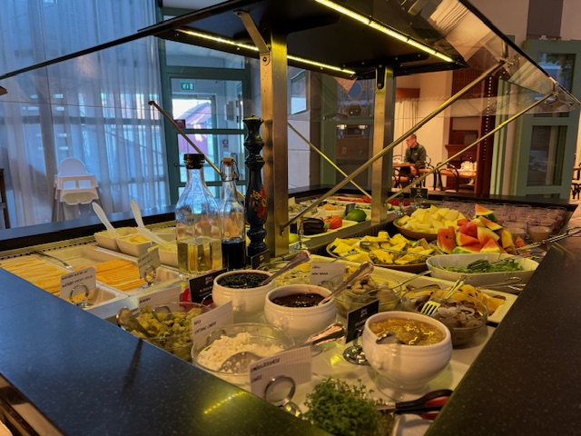 Frukosten på ett hotell kan ofta vara lite rörig, varmrätter på en plats, det kylda på ett annat ställe och dryck och kaffe någon annanstans. Så var det inte här, en bricka, bestick servetter, bröd varmrätter, pannkakor, ostar, skinka, korv, fil, sill, ”krämiga ägg,” en massa frukter, baka dina egna våfflor med sylt och grädde, wienerbröd, drycker, croissanter och kaffe, allt placerat utmed en brickbana. Fantastiskt!