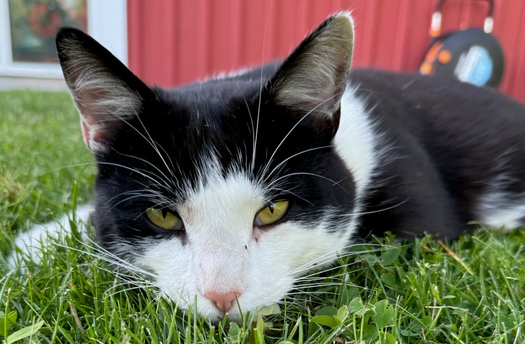 Han vill inte bara ha mat, han vill komma in (men det får han inte) och så vill han busa. I går bet han mig i armen så det blödde, när jag busade med honom. Det är ett nöje att se honom ta råttor, då busar han vilt med dem innan livet släcks. Vi vet inte var den hör hemma, men den trivs nog bäst hos oss.