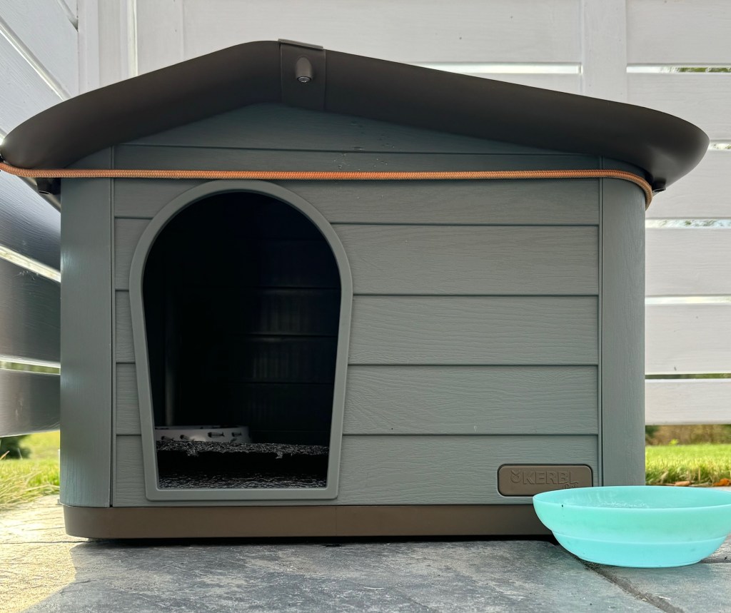 Nu har vår kisse fått en egen koja, en full skål med godismat och som skatorna hittills inte vågat sig på. Dessutom dubbla liggunderlag. Jag måste hålla den på plats med ett band, så den inte blåser sin väg.