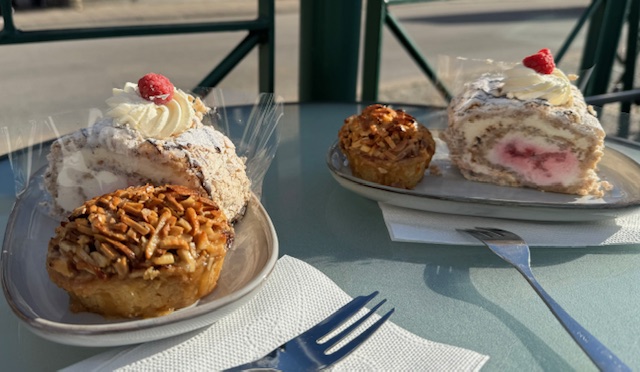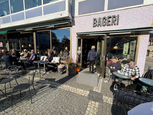 Kanske 2/3 tar med sig en påse hem, med det allra godaste och nybakade. De andra gör som vi och fikar ute på torget.