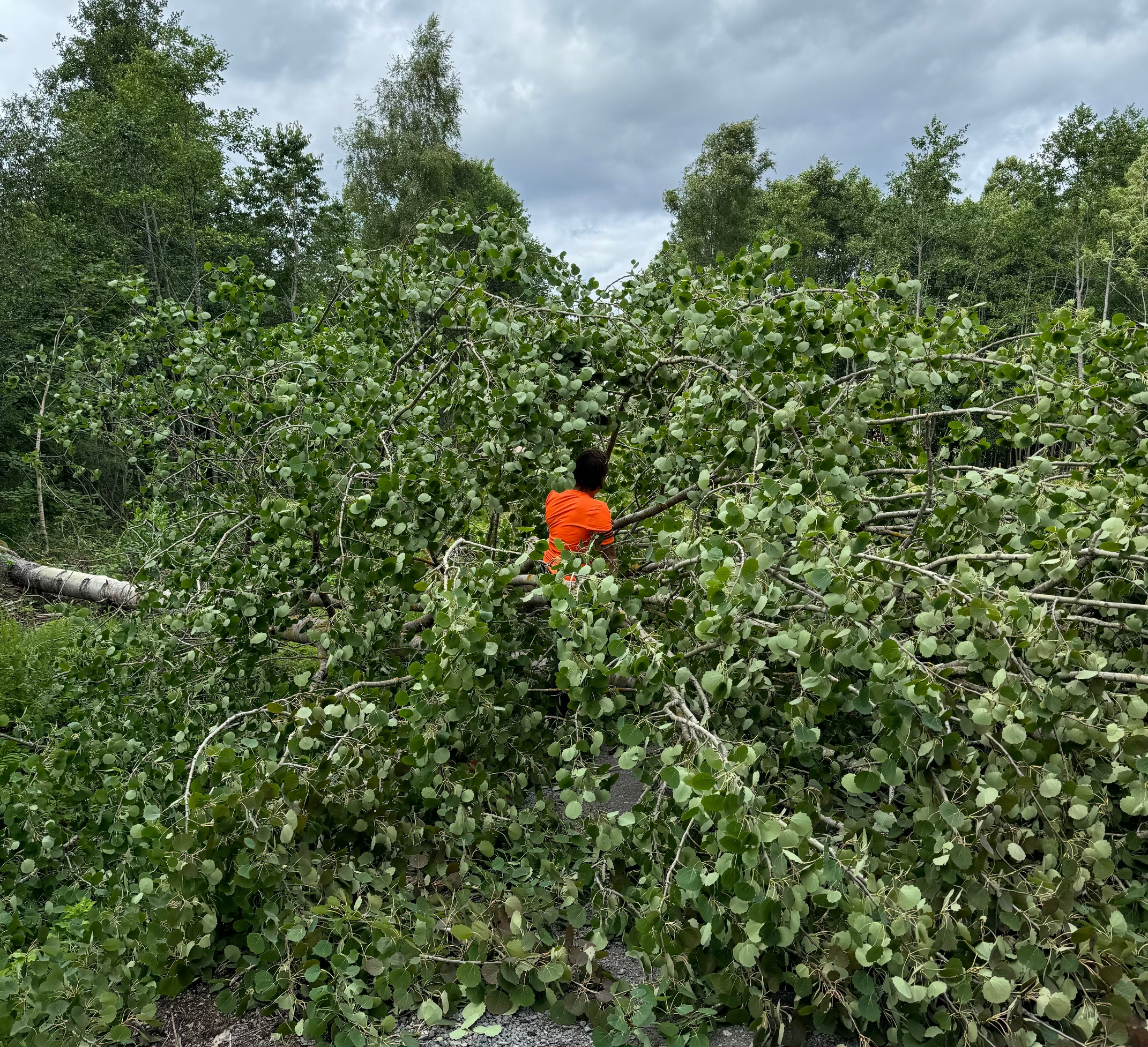 Upp till Knivlösa är det bara någon km. Där tar vägen slut och det går inte att komma vidare utan att gå eller åka med terrängfordon. När vi kör tillbaka ligger en stor asp över vägen. Det har inte gått av vid roten, utan längre upp till på stammen, längre in i skogen och sedan kastats ut på vägen.