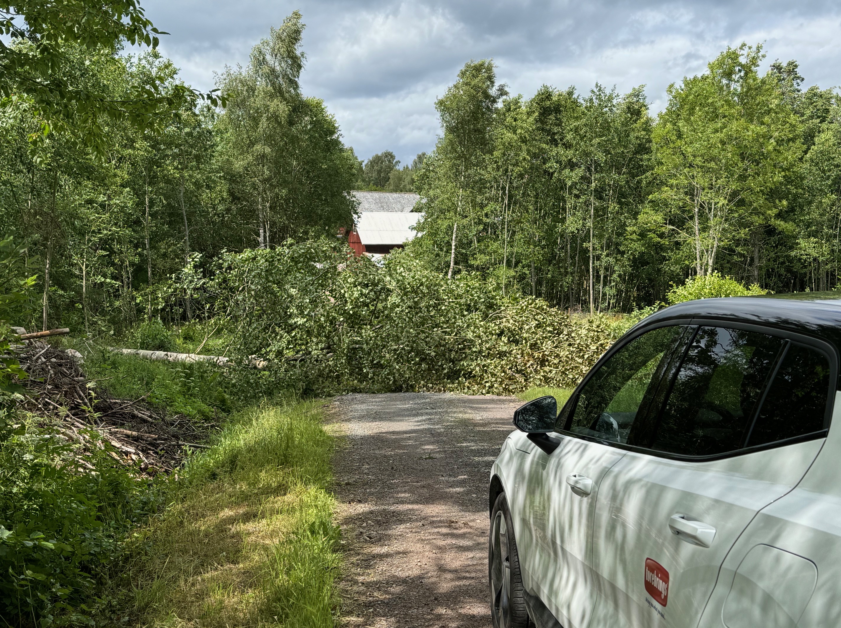 Under alla år som jag har kört denna väg tur och retur, har jag aldrig sett en enda människa. Men inte idag, strax före vägstoppet passerar vi en tjej från granngården. Hon visste direkt vem som bor på gården idag och ringde upp honom. Efter en stund kom en man, ägaren till gården, med en stor traktor och motorsåg. På en kvart var vägen öppen igen.